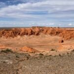Bayanzag means ‘rich in saxaul shrubs’ in Mongolian, but the rest of the world knows it as the Flaming Cliffs — named by Andrews for the way the red sandstone catches the light at sunrise and sunset. The formation is a 30-meter escarpment of orange-red rock overlooking a broad desert basin, and walking along its edge in the late afternoon, with the colour deepening every few minutes, is one of those experiences that earns Mongolia its reputation.