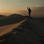 The camel ride to the dune base is worth it for the angle alone: looking up at 300 meters of shifting sand from the back of a Bactrian camel puts the scale into your body rather than just your eyes. The climb to the crest at sunset is the objective — the light from the west hitting the western face while the eastern face goes purple, and the shadow line moving up the dune face, is one of the best light shows in the Gobi.
