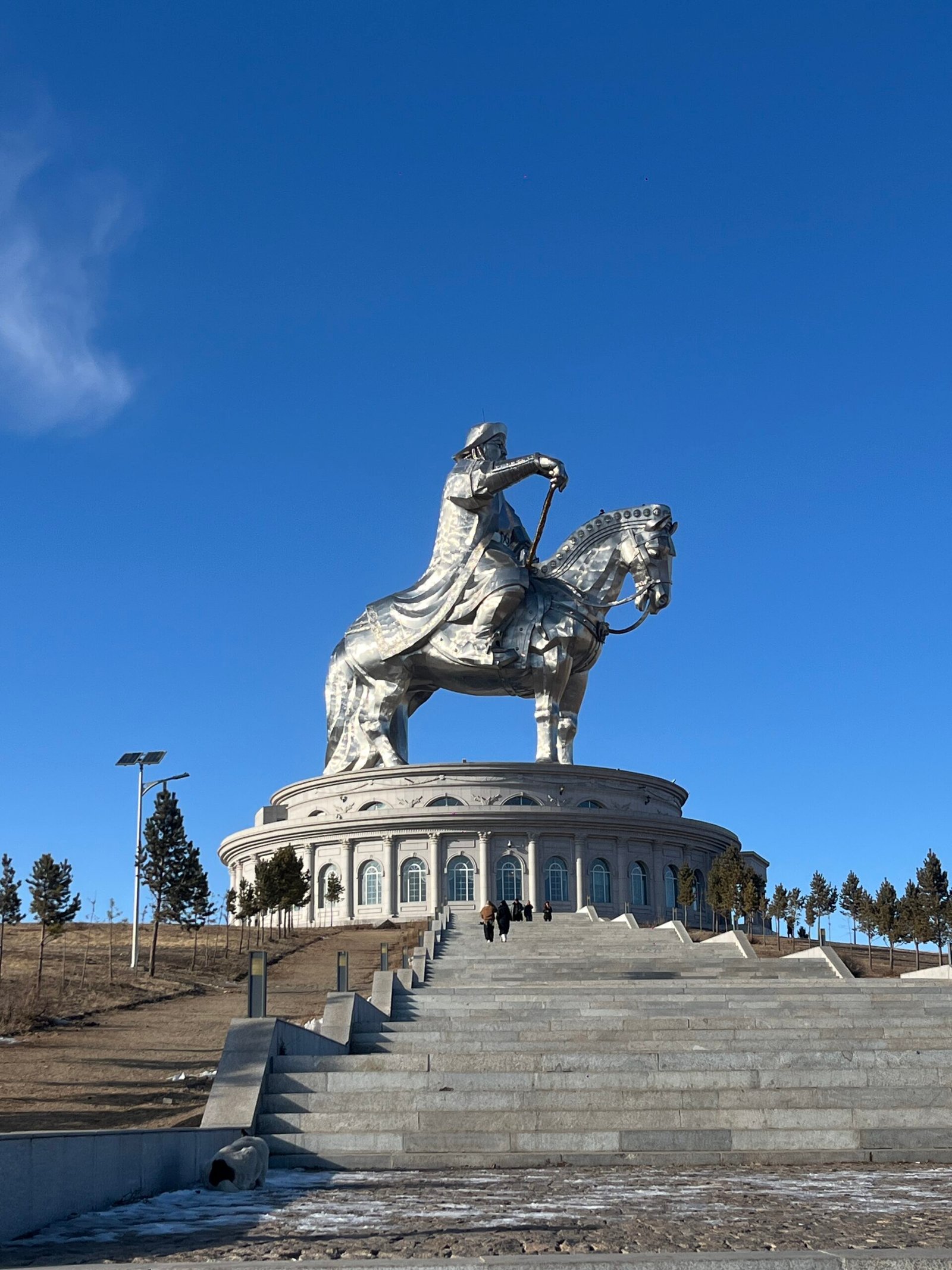 Duration: 2 hours. The 40-meter stainless steel statue, 54km east of UB, stands at the site where Temujin allegedly found the golden whip. The elevator inside the horse reaches a viewing platform at the rider's chest level.